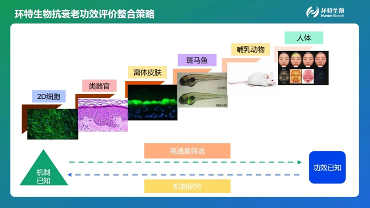 分享中,环特生物首席科学家李春启博士围绕“2D细胞+类器官+离体皮肤+斑马鱼+哺乳动物+人体“抗衰老功效评价整合策略,详细解读了环特多维度抗衰老模型特色优势,揭示了多维度抗衰老评价模型技术体系在抗衰化妆品、功能性食品及药物研发、功效与安全性评价中的巨大应用潜力。