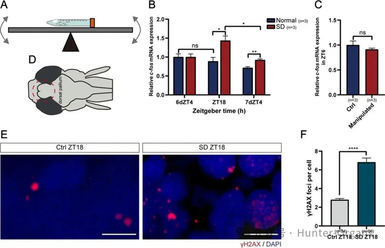 研究人员通过药理学、光遗传学技术等诱导斑马鱼神经元DNA损伤模型后发现,神经元活动和诱变剂能够诱导DNA损伤,进而触发睡眠和DNA修复过程。一旦 DNA 损伤积累超过最大阈值时,斑马鱼就会进入睡眠状态,斑马鱼至少需要 6 个小时的睡眠来修复DNA损伤,如果睡眠时间不足,DNA 损伤就无法被充分修复。