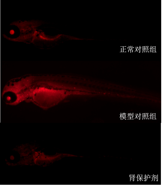 评价保护肾脏功效有两个指标:1. 肾性水肿发生率。由于斑马鱼通体透明,肾性水肿可以明显的被观察到。2. 肾小球滤过率。通过注射荧光物质,正常斑马鱼可将荧光物质排出体外,肾小球滤过功能损伤的斑马鱼不能将荧光物质排出体外。观察斑马鱼全身荧光强度可分析肾小球滤过率。