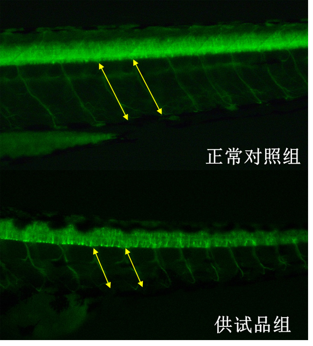 【评价结论】1.经过每组30尾斑马鱼的对比实验,服用/注射供试品组的斑马鱼脊椎骨荧光强度明显减弱、数量明显减少,与正常对照组存在明显的差别。2.本实验证实了该供试品对斑马鱼有骨毒性。
